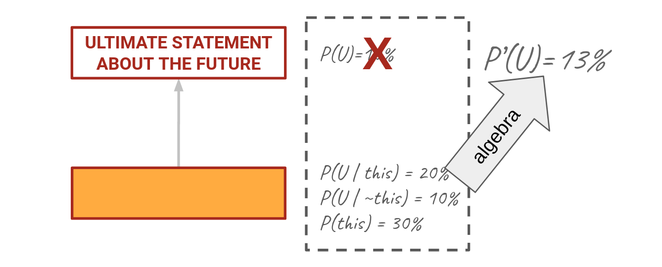 So I think about O—P(O)—and what I would think about U if I knew O was true—P(U|O)—and if I knew it was false—P(U|~O). Do a little algebra on that and you'll find a new P(U) of 13%. Thinking about O helped me clarify what I thought about U.